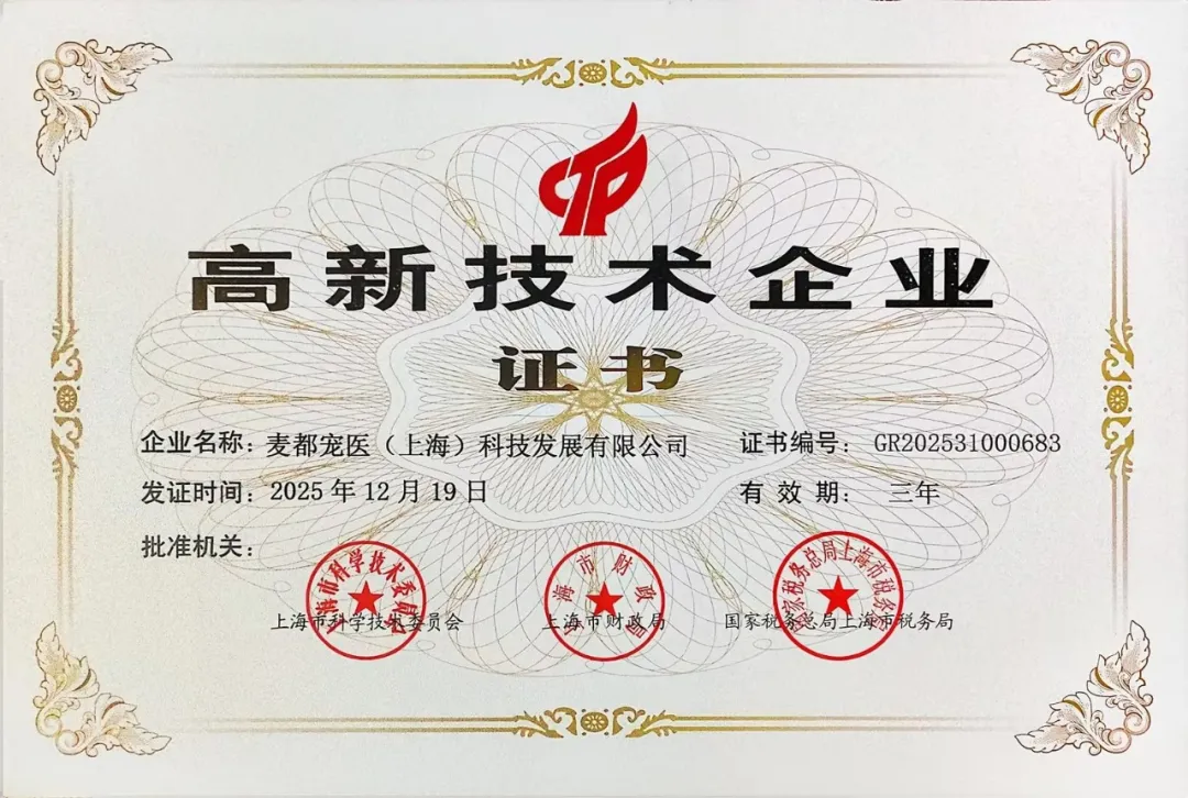 重磅喜讯!麦都宠医(上海)科技发展有限公司正式荣获“国家高新技术企业”认证!这不仅是对麦都研发创新能力、核心技术实力的国家级权威认可,更是麦都在宠物消毒护理用品深耕行业、以科技赋能宠物护理的重要里程碑。